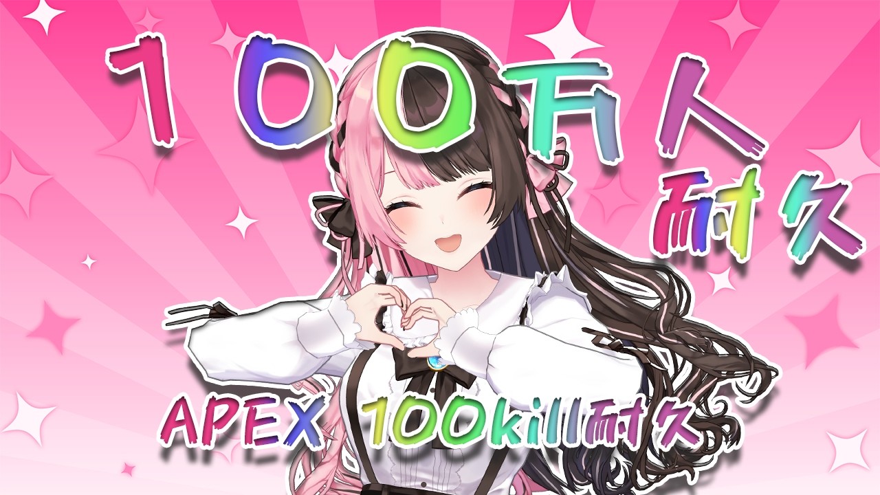 配信タイトルには「APEXで100キル耐久」も組み込まれており、チャンネル登録者数100万人とApex Legends 100キルのダブル耐久という形で達成の瞬間をライブで視聴者と共有。